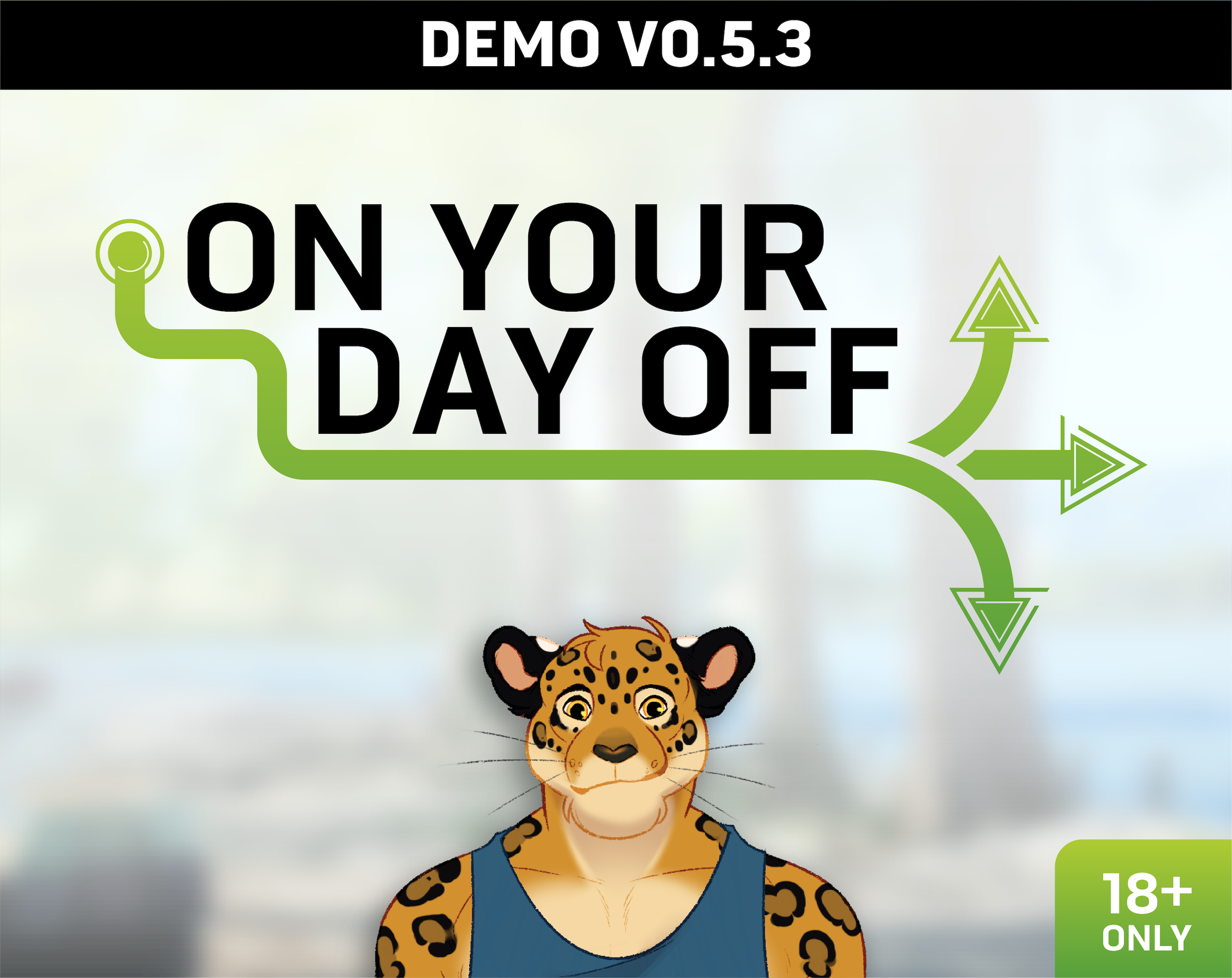On Your Day Off is a furry, adult, gay-focused visual novella with you as the main character. You'll be a male jaguar who's getting his day started, and you'll need to figure out what activities you want to get up to. Your choices will shape what kind of day you have as you go around the city of San Lugos—you can take things easy, get involved in some seriously steamy scenes, go on a date, or explore around town. It's all up to you!